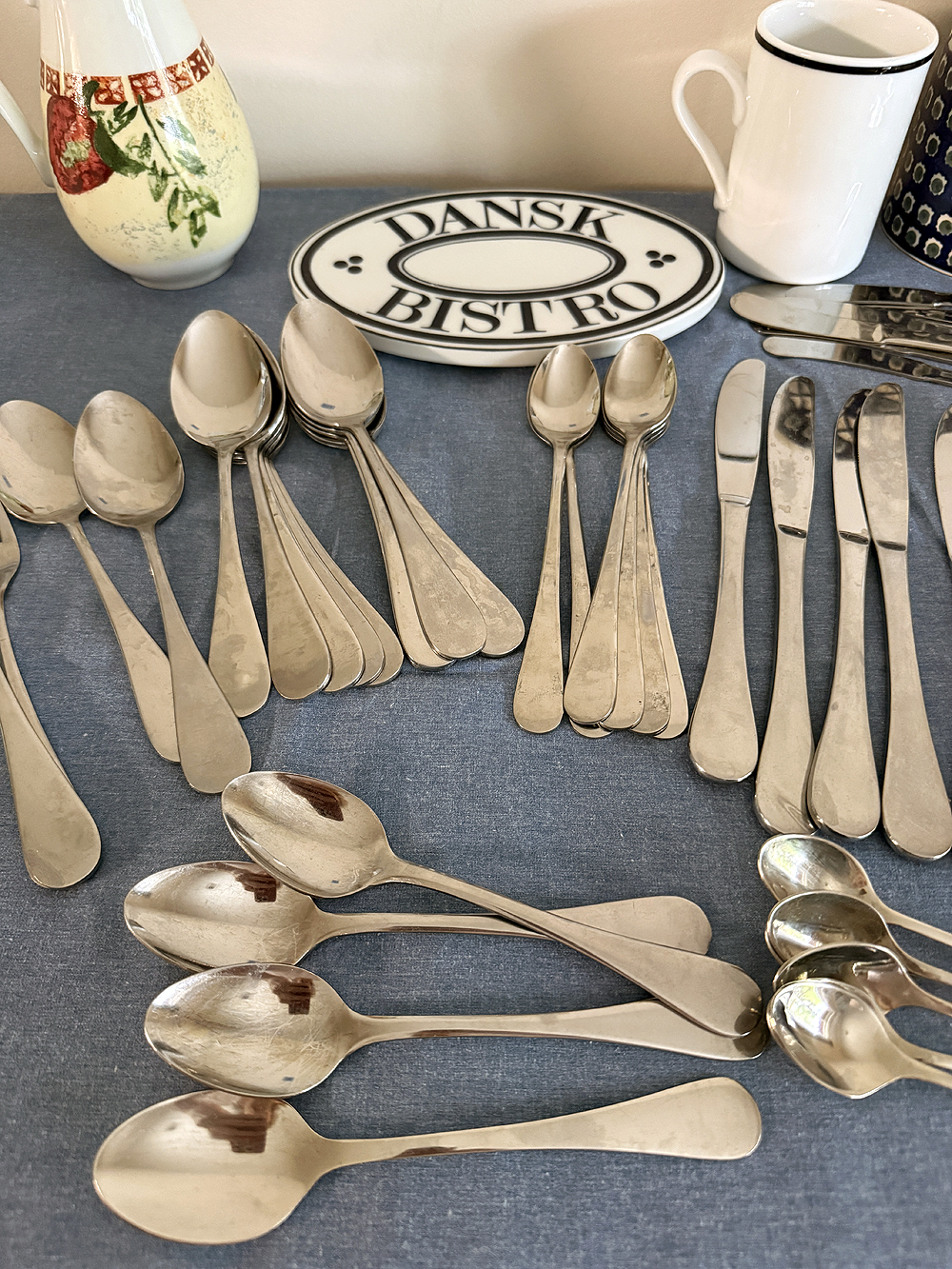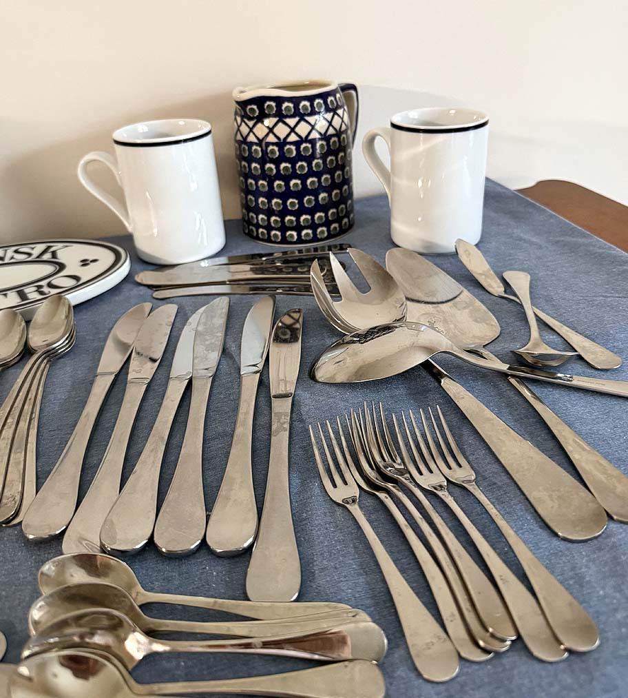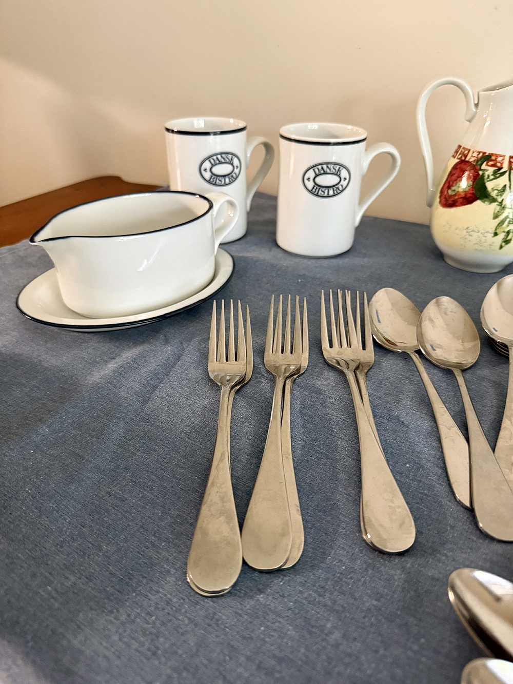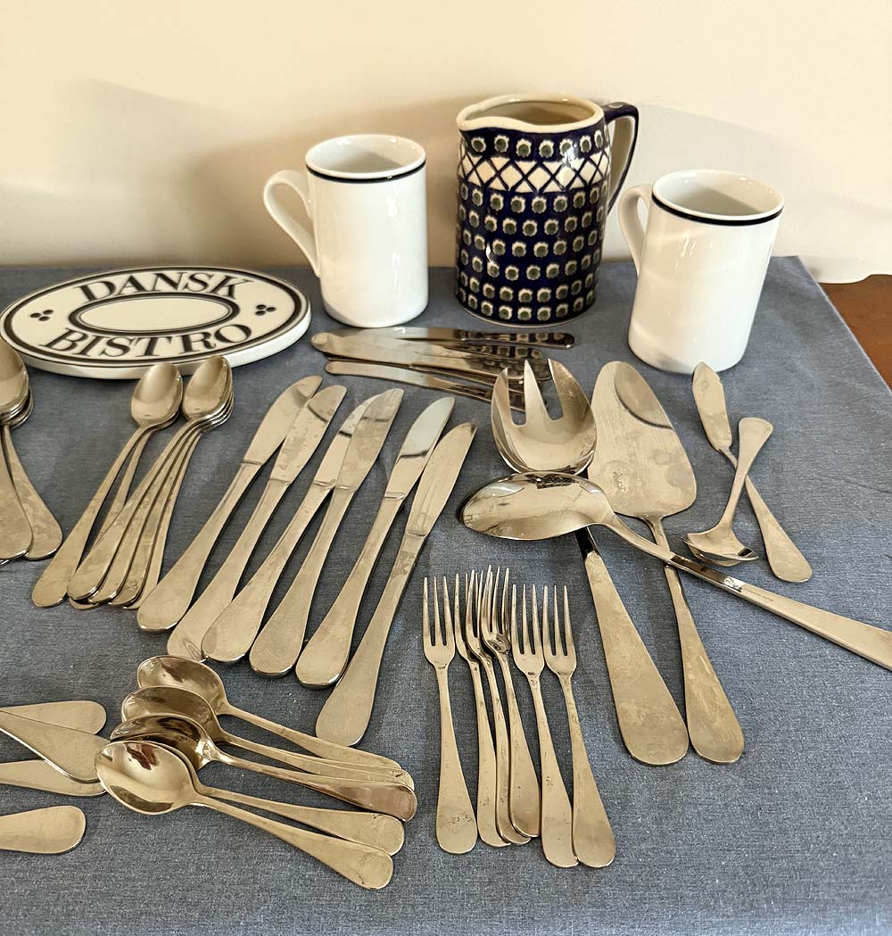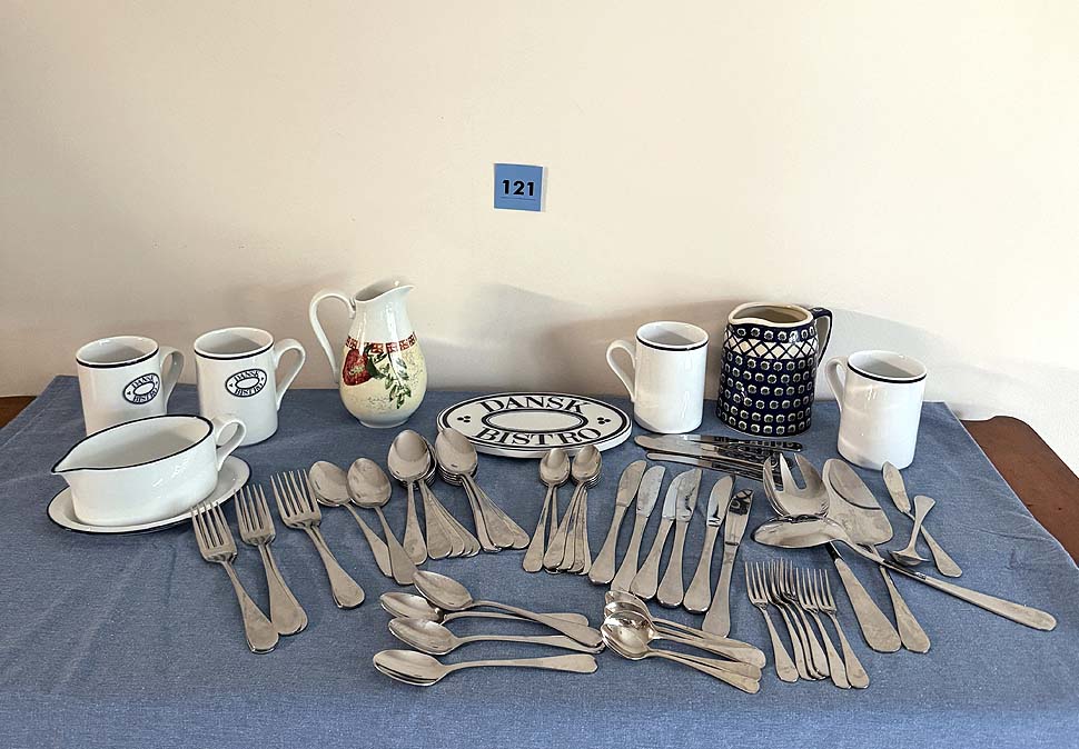 121. (4) Dansk Coffee Cups + Dansk Plaque + Dansk Syrup Pitcher + Polish Pottery Pitcher + Dansk Gravy Boat + (50) pc Dansk Stainless Flatware