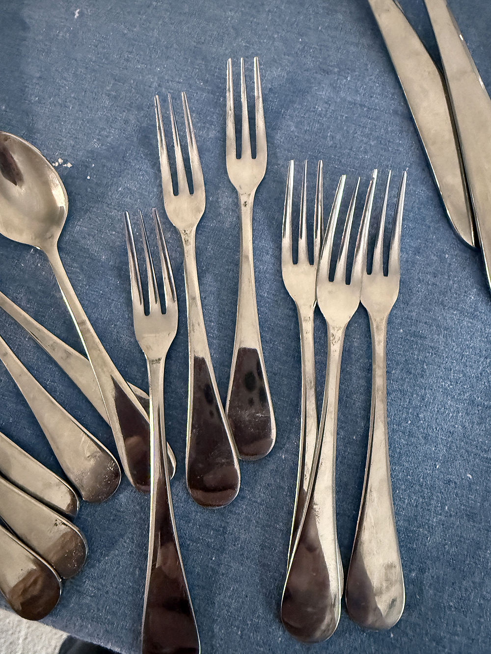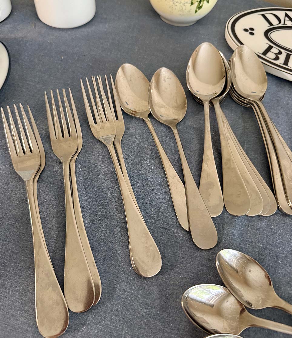 (6) forks, (12) large spoons, (4) teaspoons, (6) iced tea spoons, (6) dinner knives, (6) butter knives, (5) serving utensils, (6) cocktail forks, (6) demitasse spoons