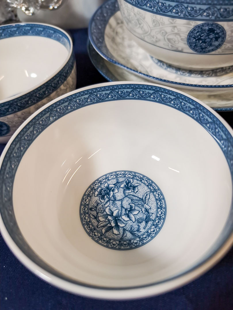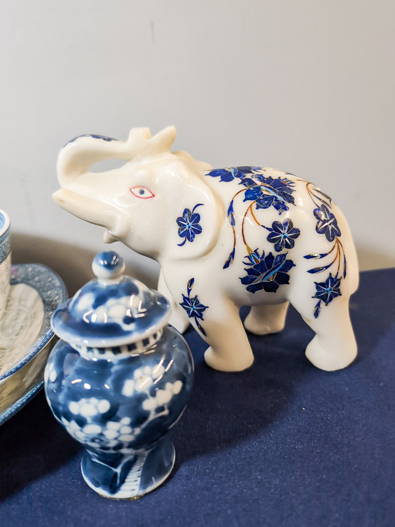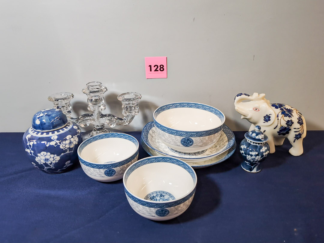 128. Porcelain Dishes (2) Serving Bowls, (1) Soup Bowl, (2) Berry Bowls, Marble Elephant, & Decor