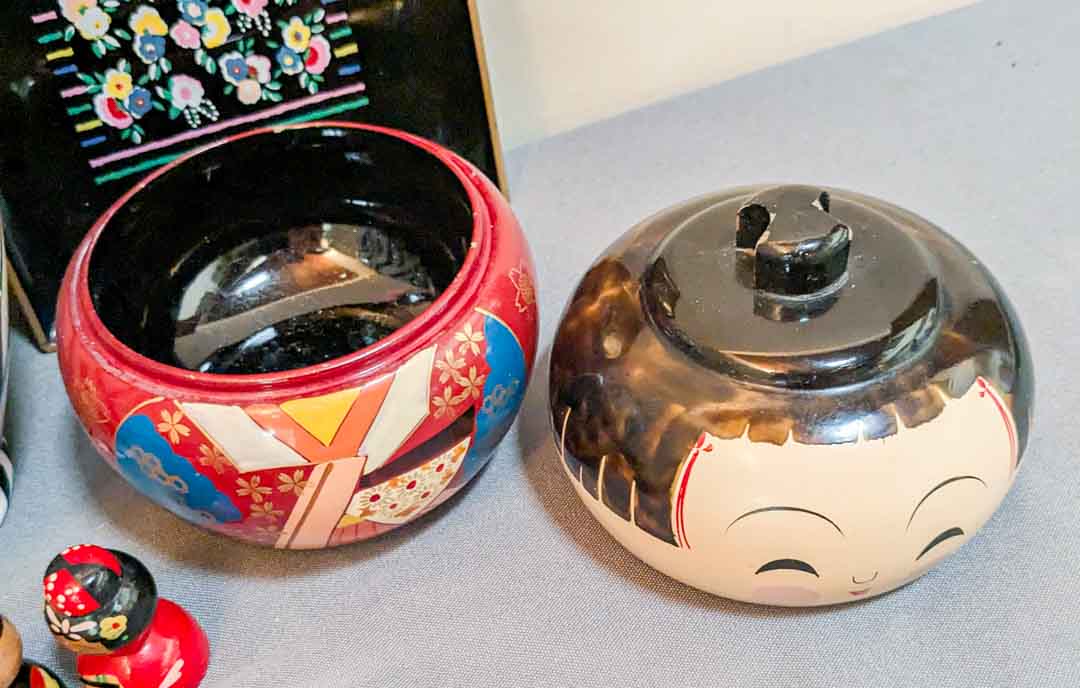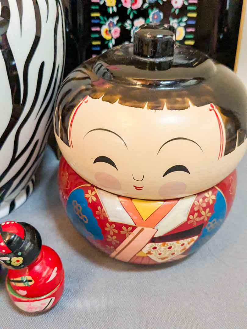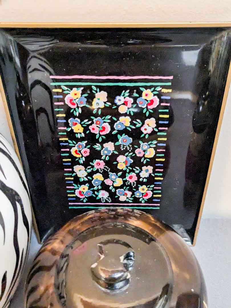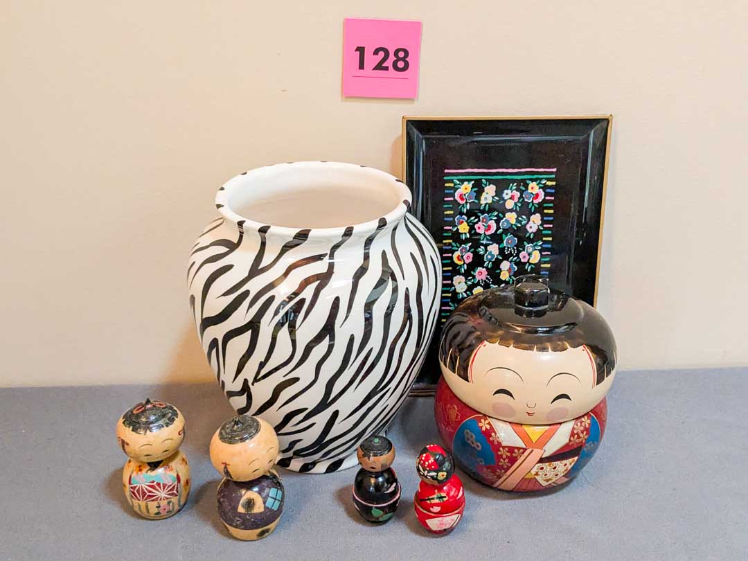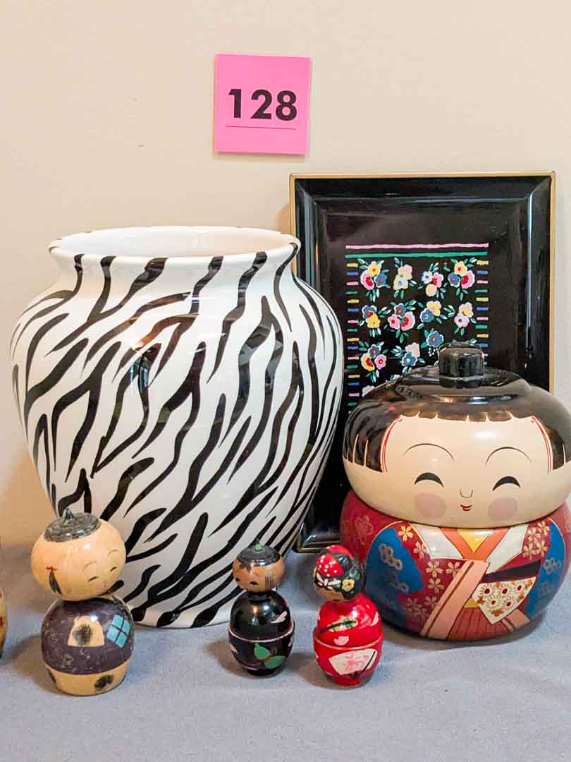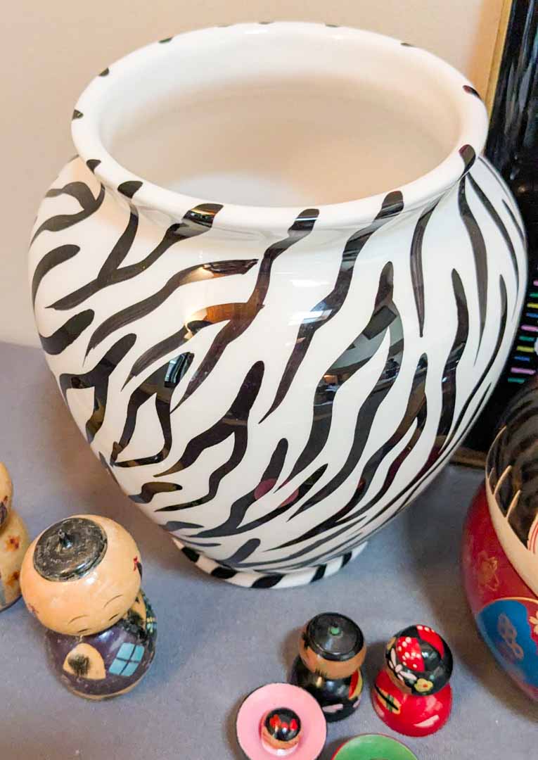 128. Zebra Vase, Lacquered Tray + Asian Decor