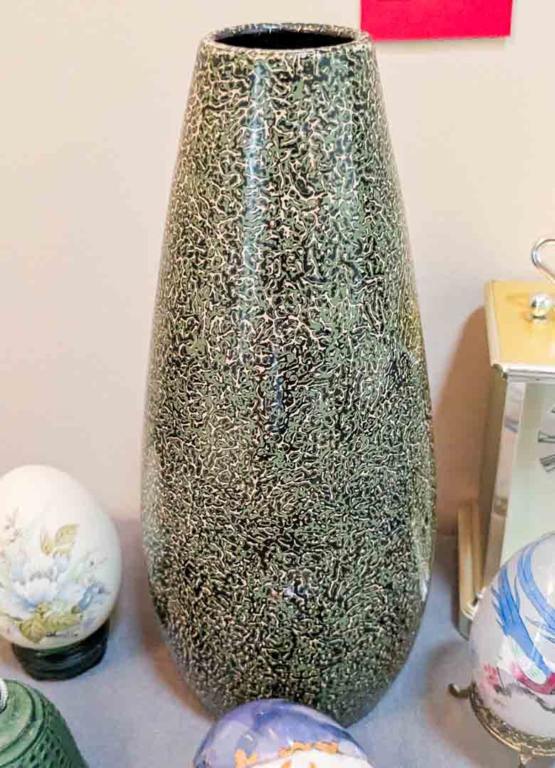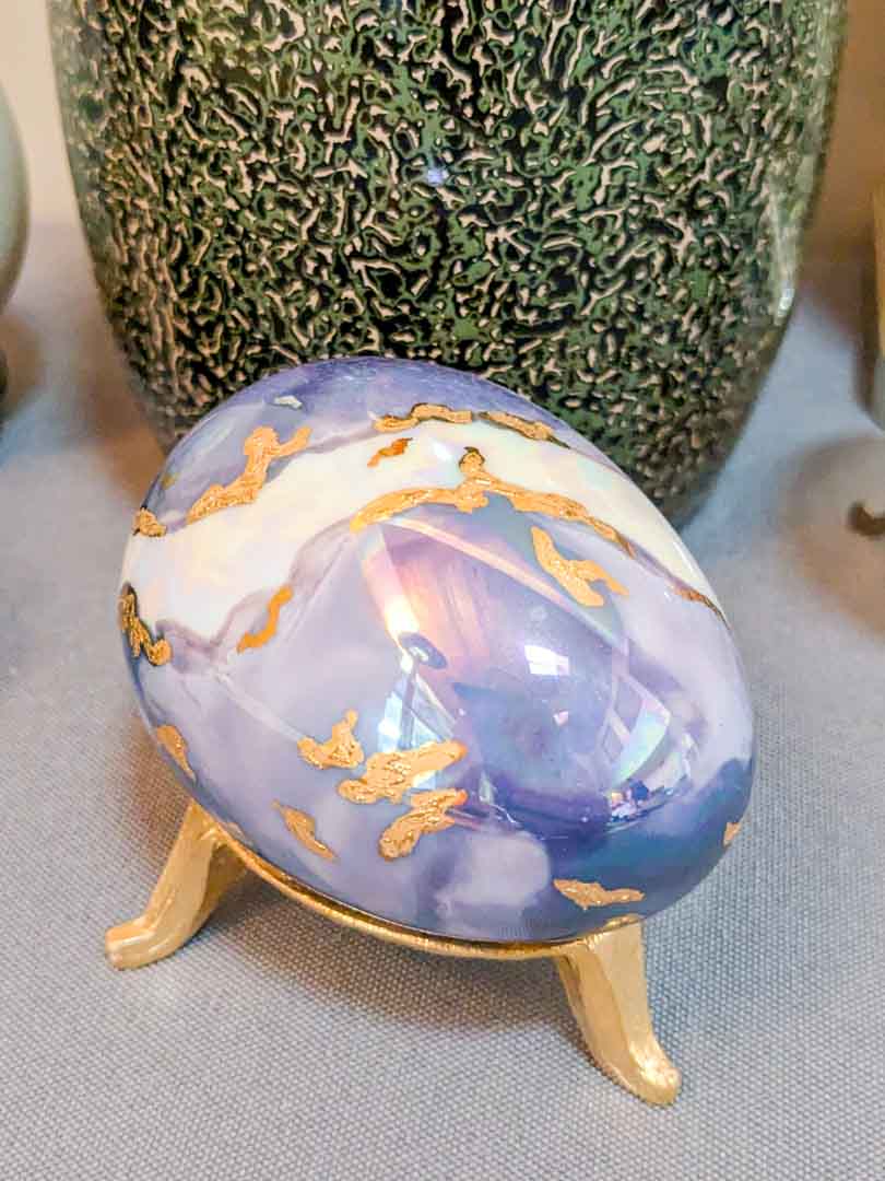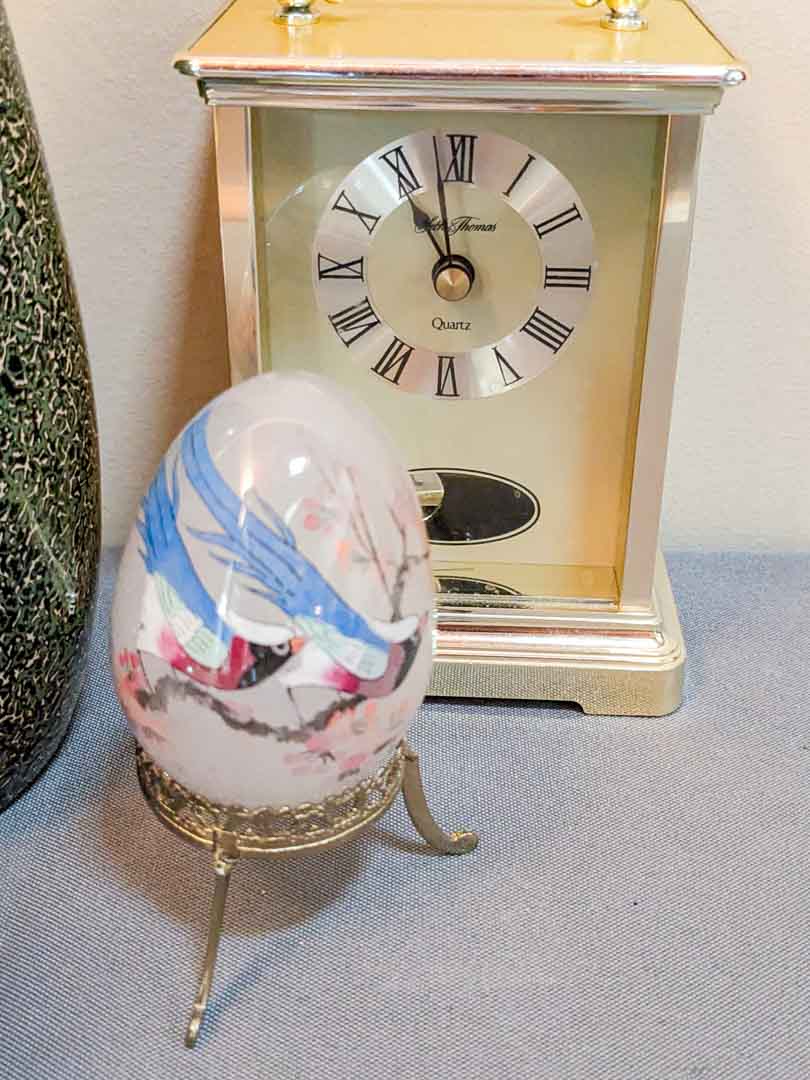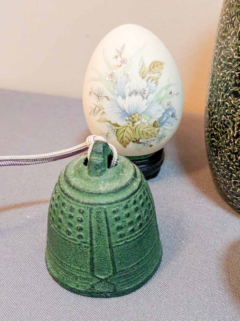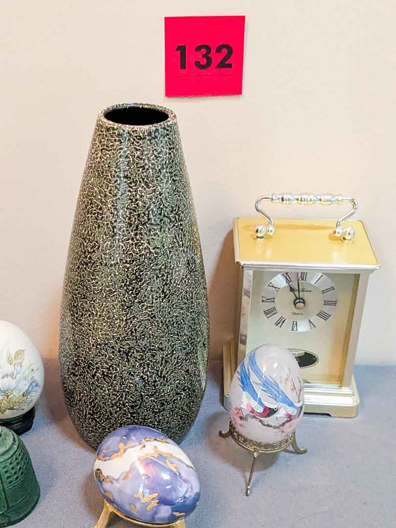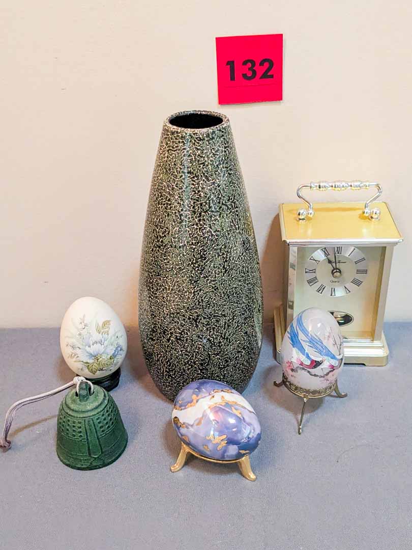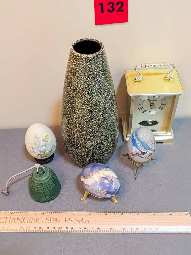 132. Lacquered Vase, (3) Eggs, Bell + Clock