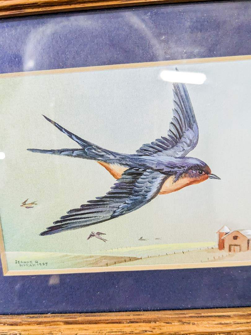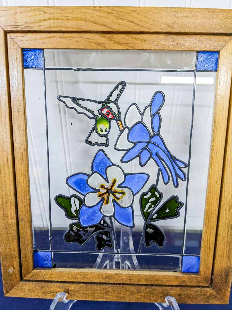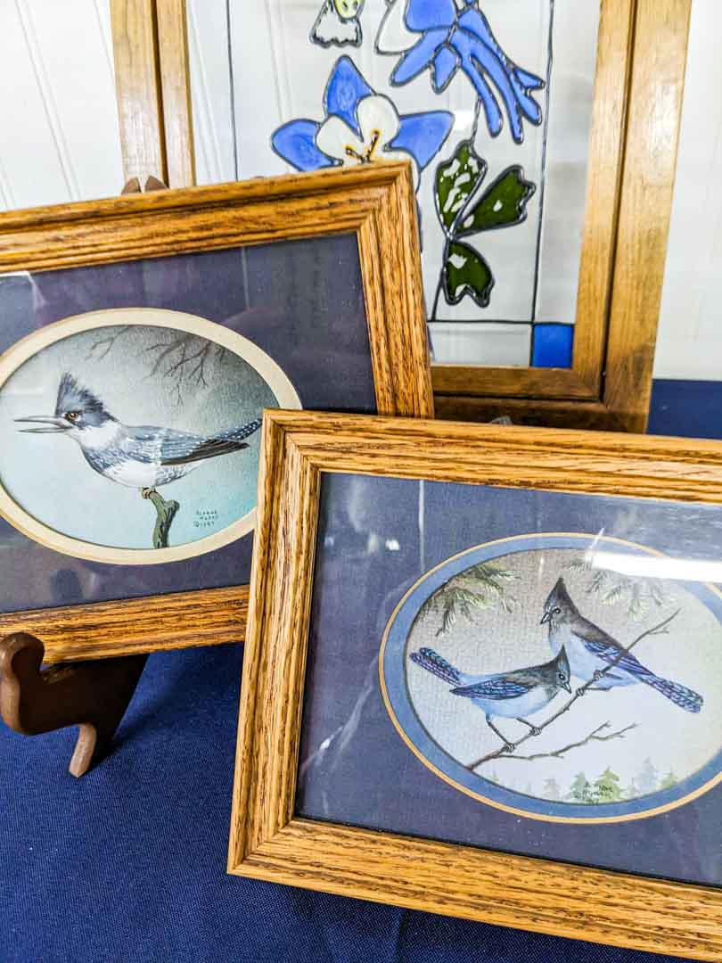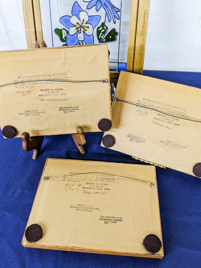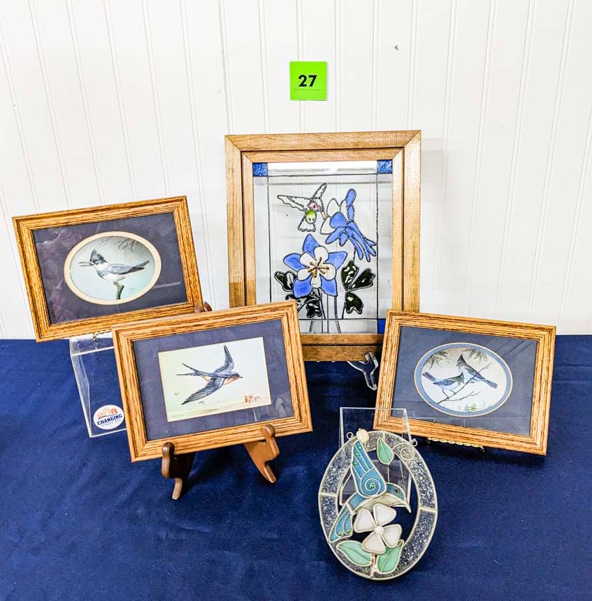 27. (3) Signed Gouache and Pastel Bird Pictures 8″ W x 6″ T + Sun Catcher + Painted Glass Picture