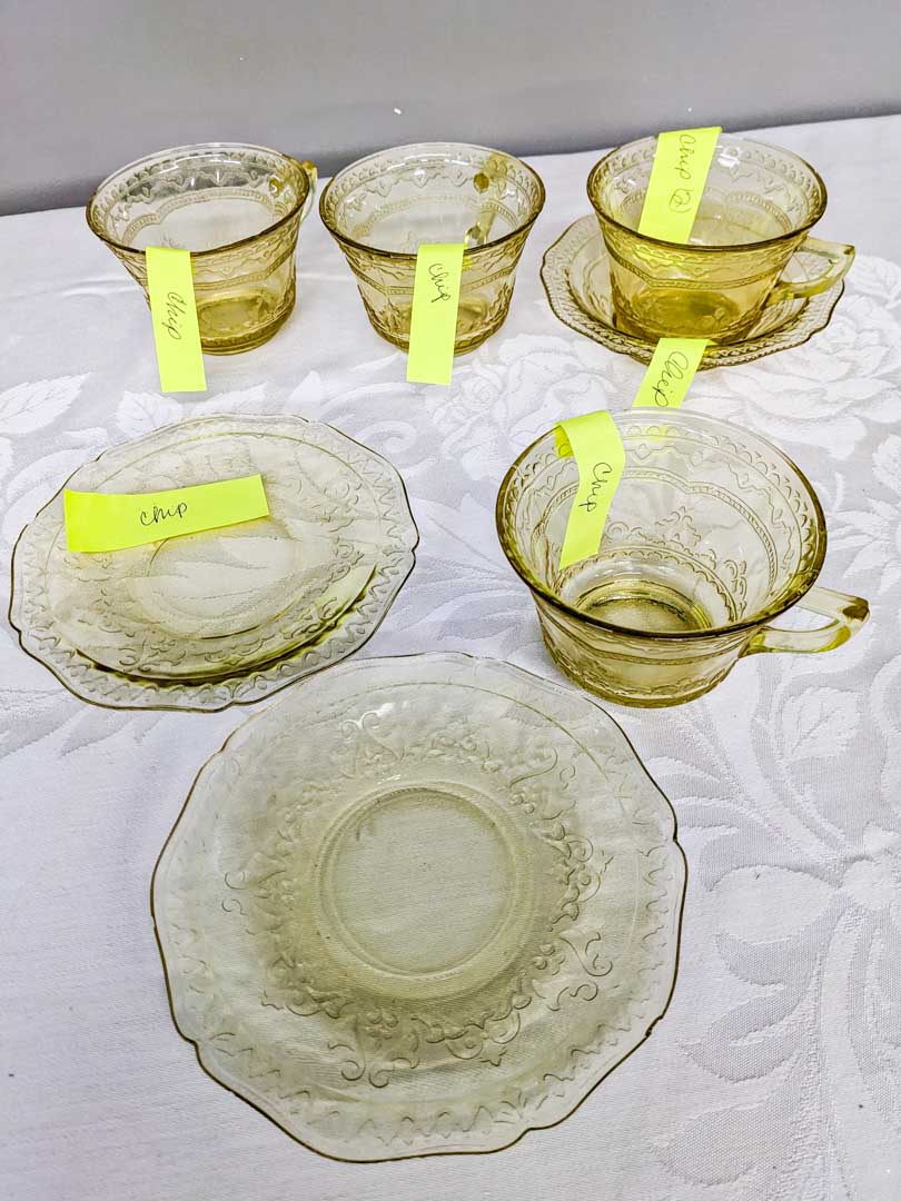 some pieces with minor damage: (4) cups w flea bite rim chips, (2) saucers w flea bite chips, (1) berry bowl w flea bite chip
