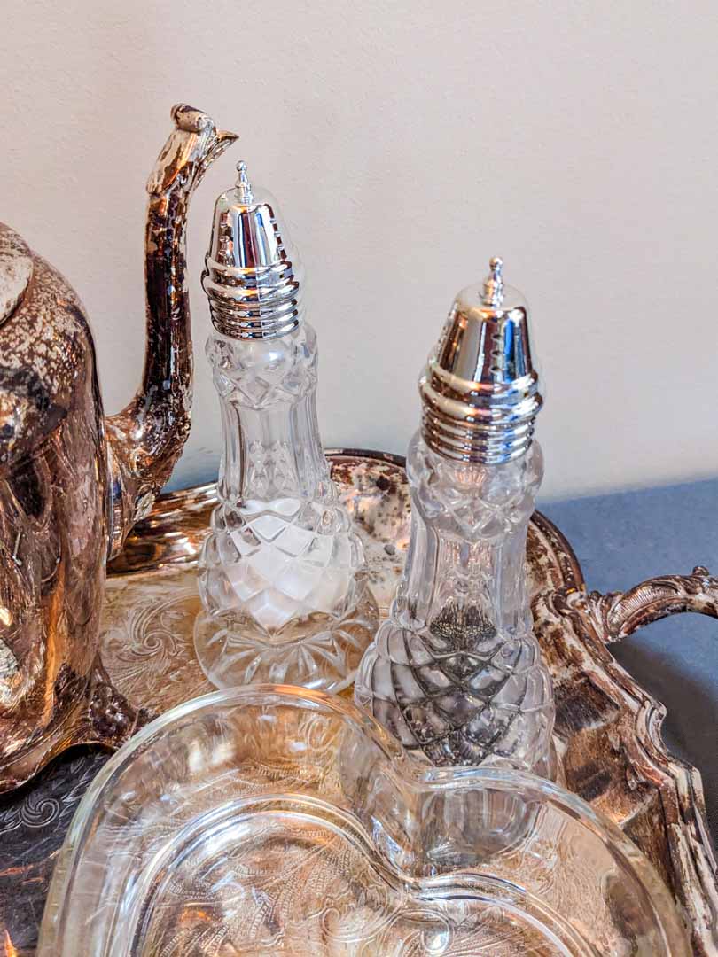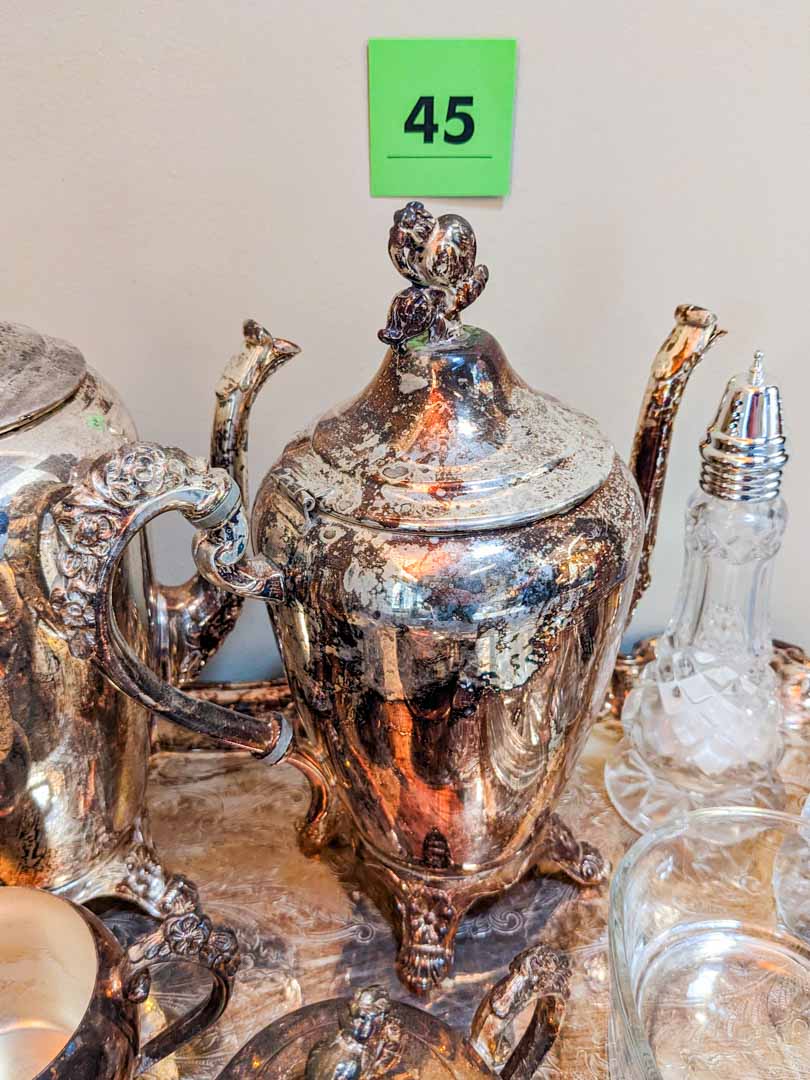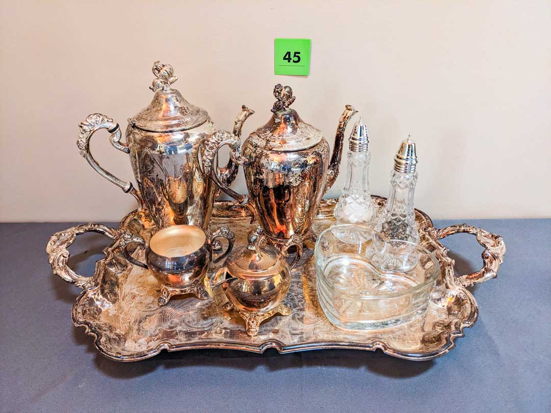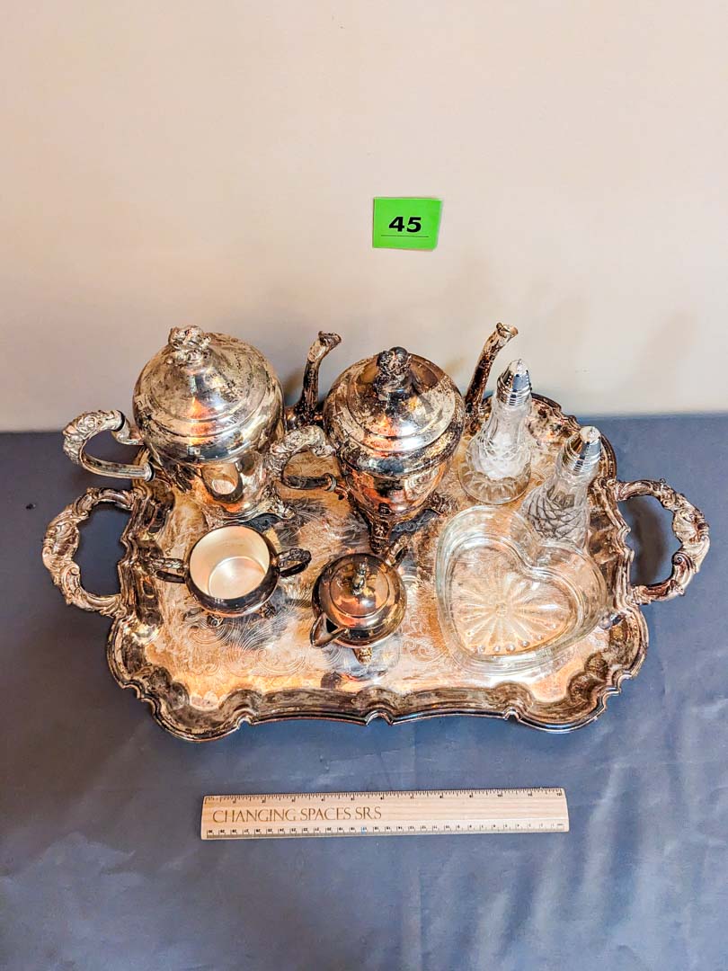 45. Silverplate Tray, (2) Teapots, Sugar + Creamer, Shakers + Heart Dish