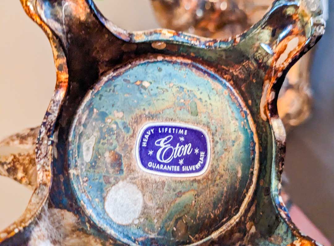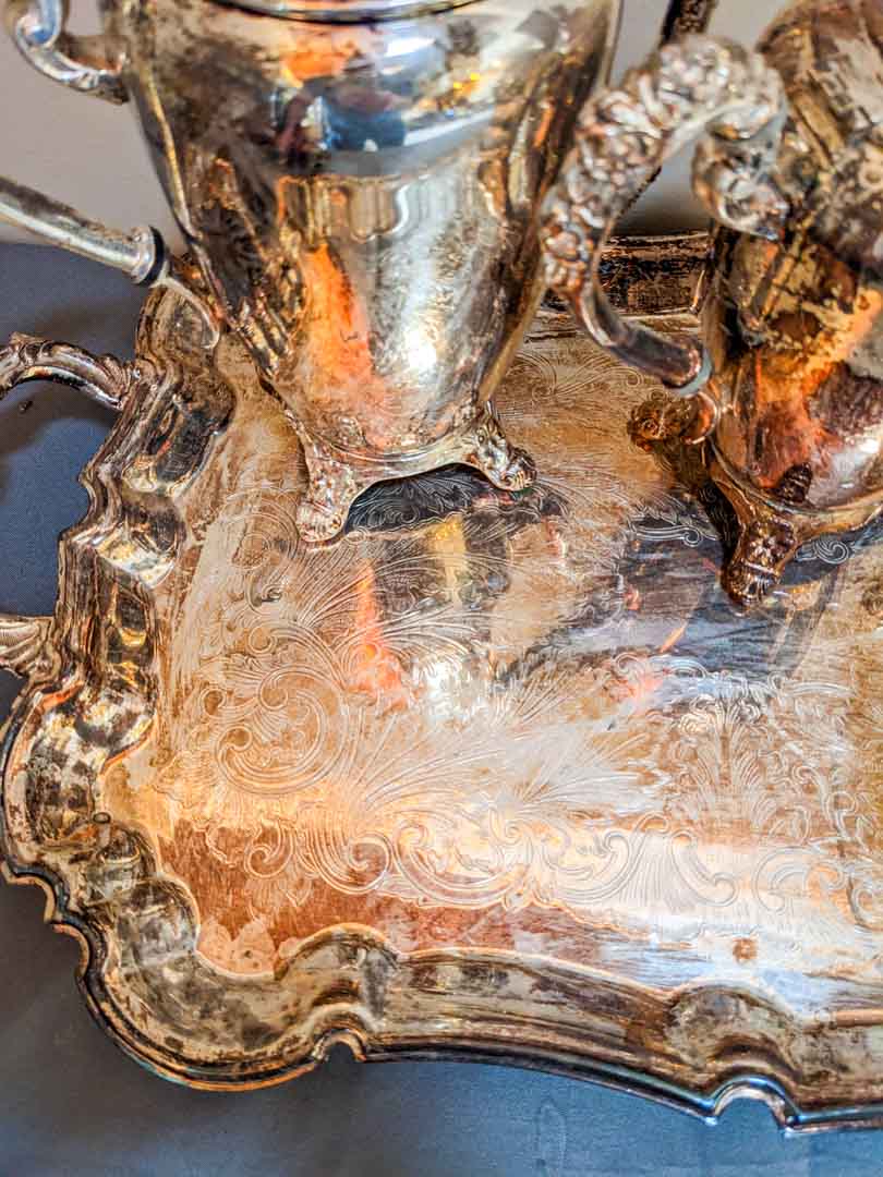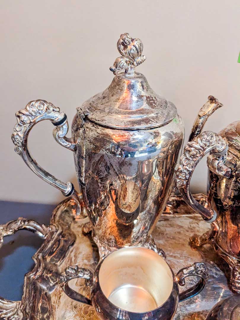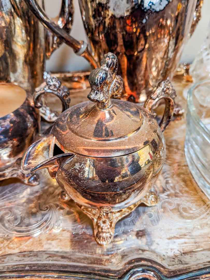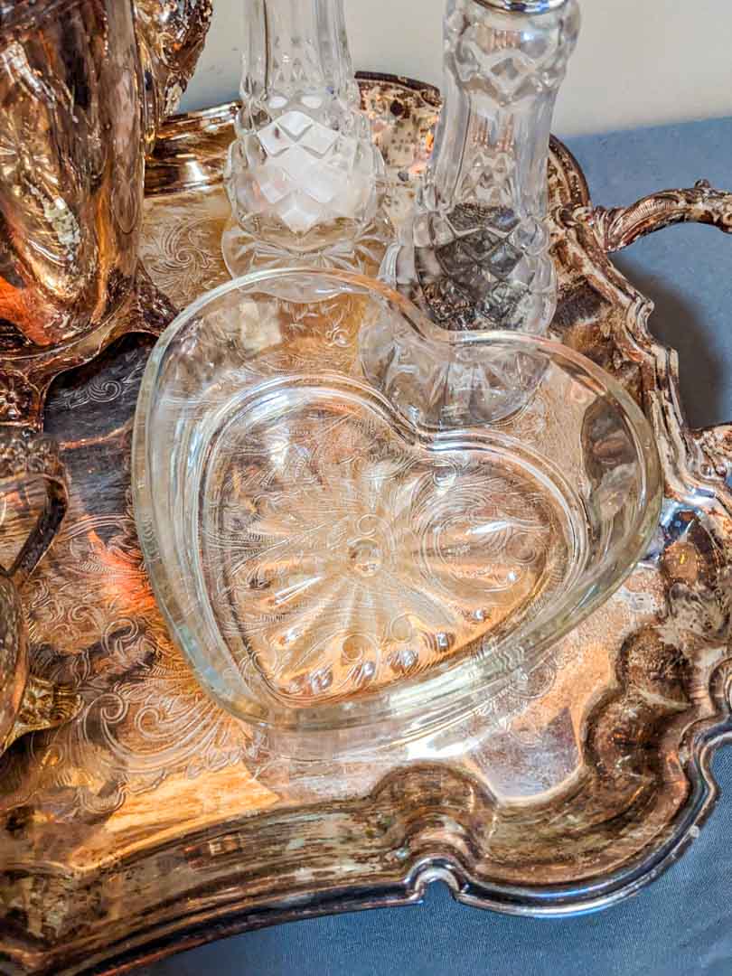 45. Silverplate Tray, (2) Teapots, Sugar + Creamer, Shakers + Heart Dish