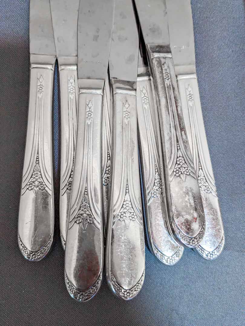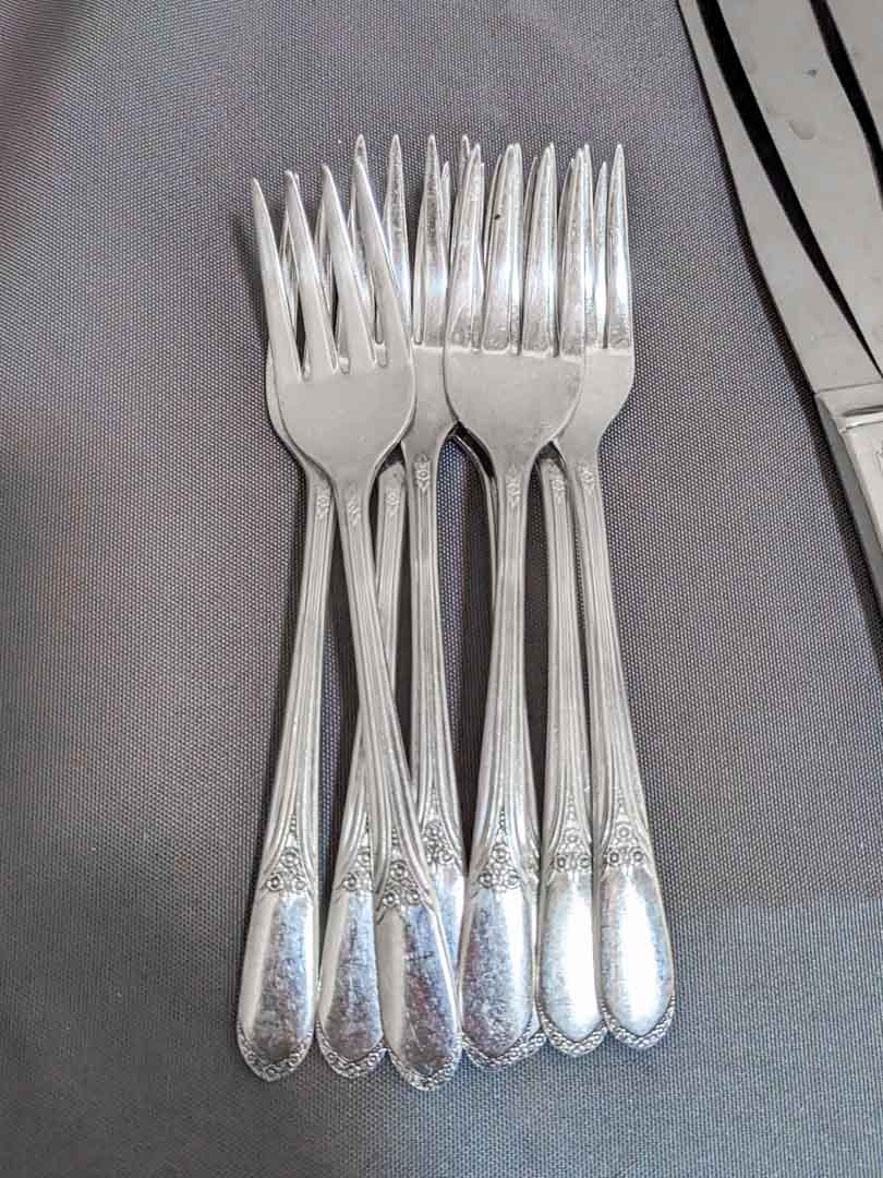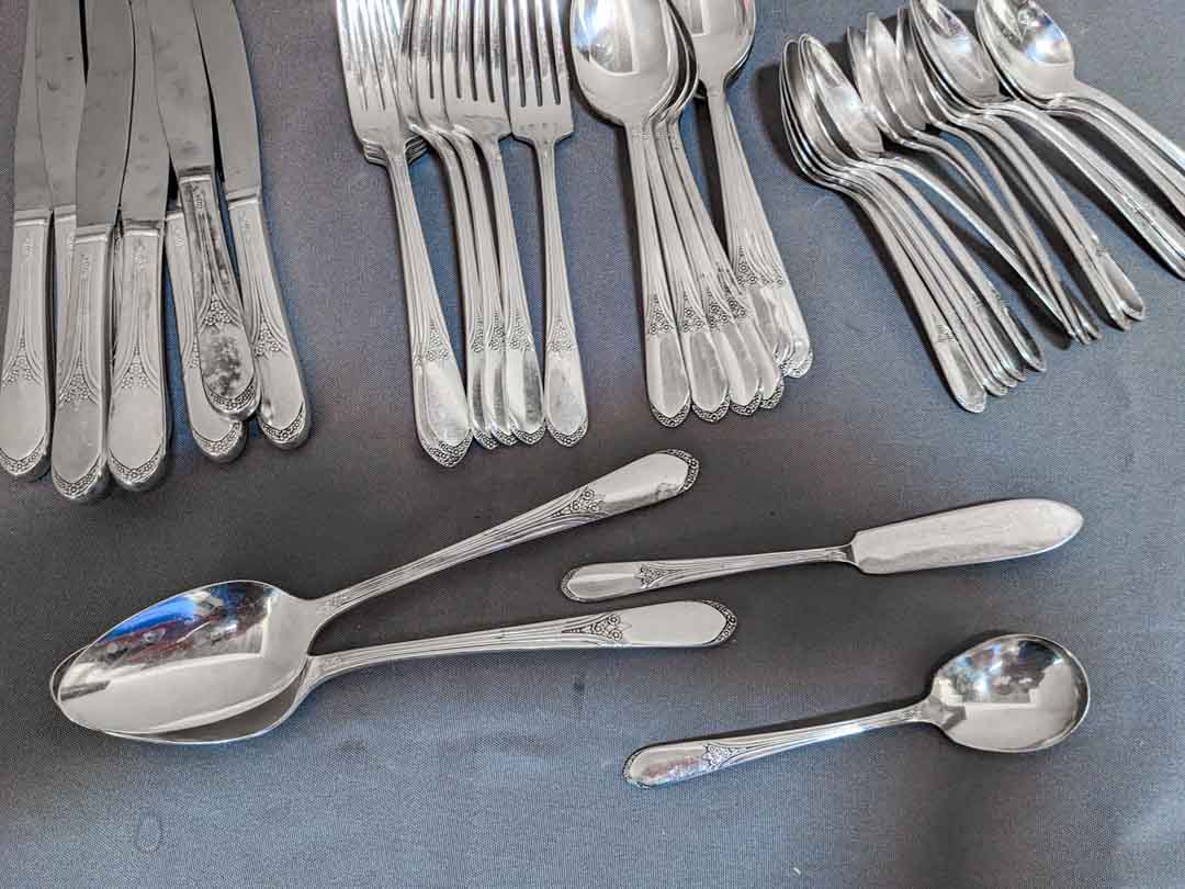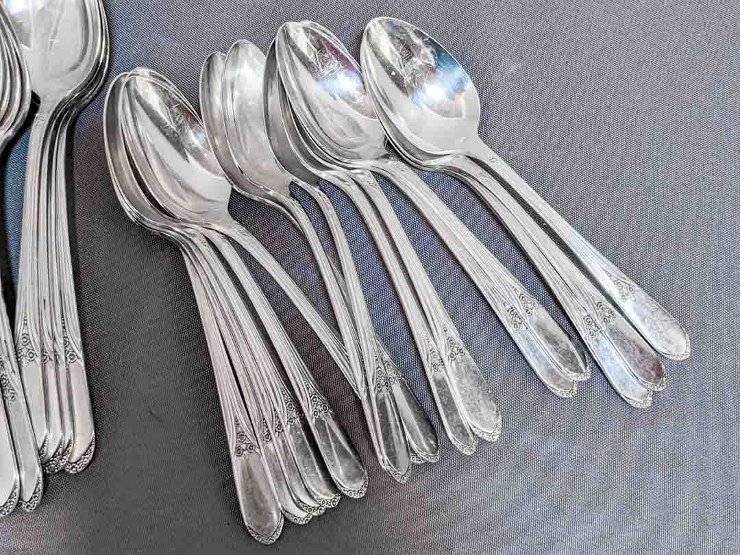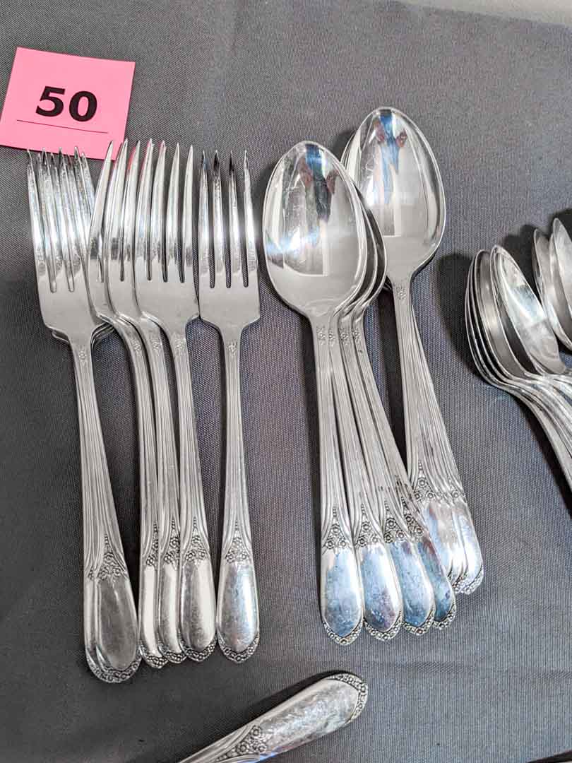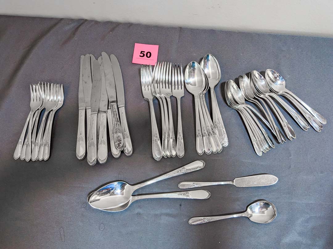 50. Rogers Silverplate Flatware – (16) Spoons, (8) Dinner Forks, (8) Knives, (8) Salad Forks, (8) Soup Spoons + (4) Serving Pcs.