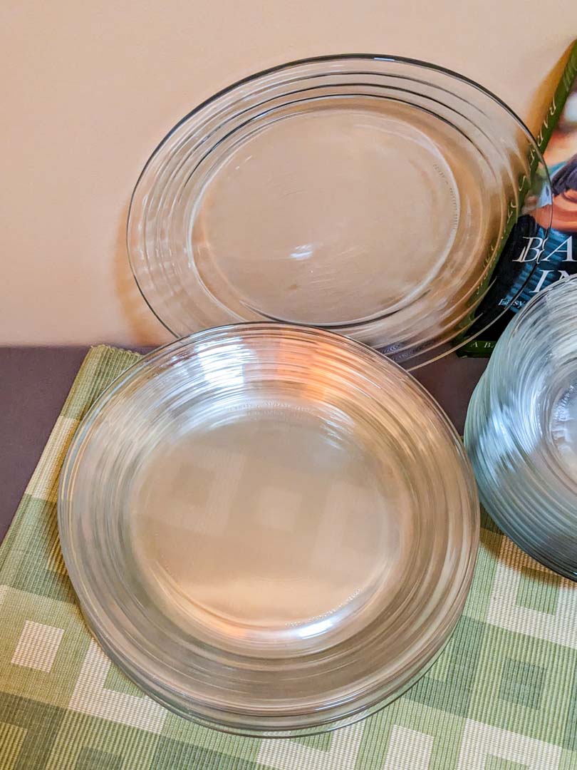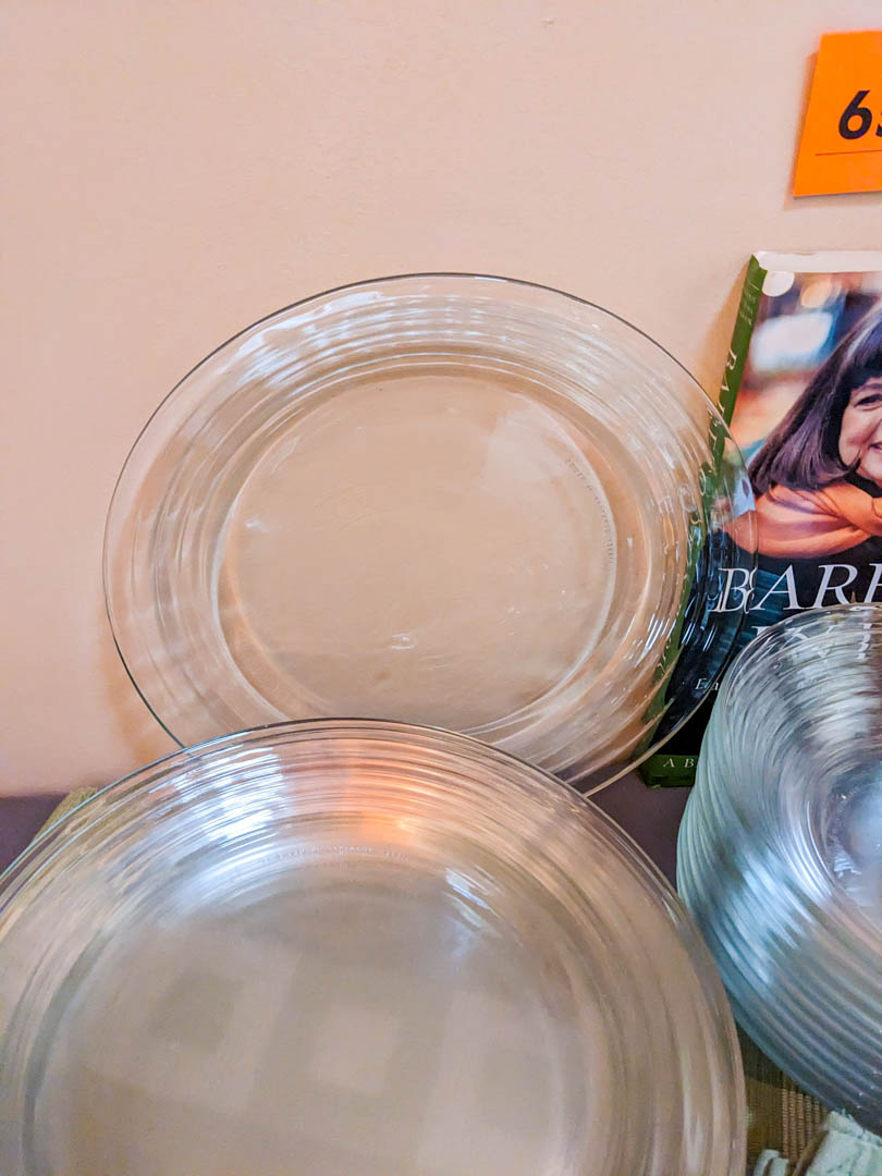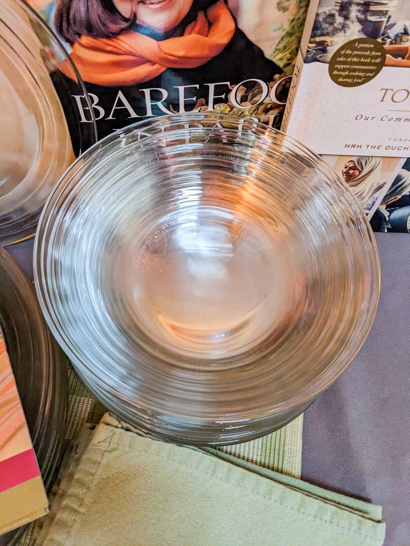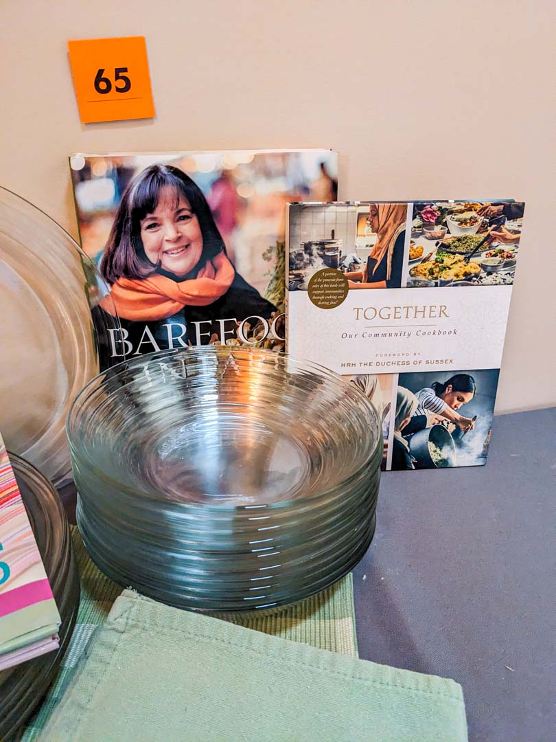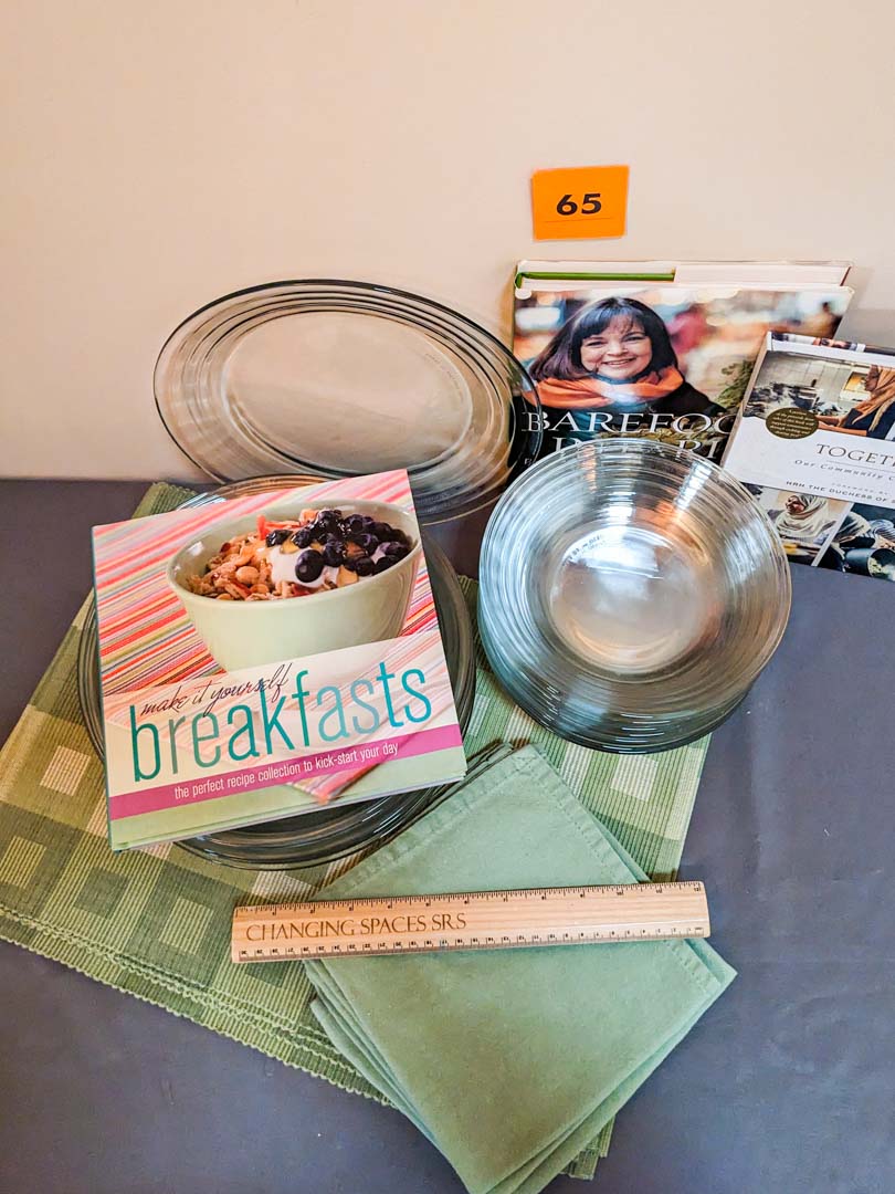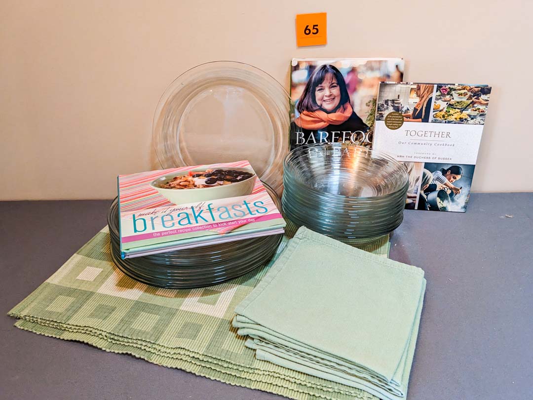 65. (11) Glass Bowls, (10) Plates, (3) Cookbooks, Placemat + Napkins