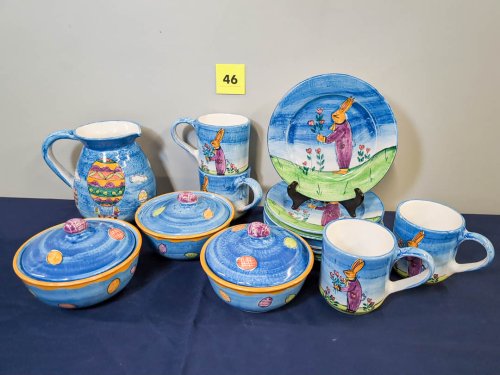 46. Hand Painted Easter Dishes, (1) Pitcher, (5) Mugs, (6) Plates, (6) Lidded Bowls
