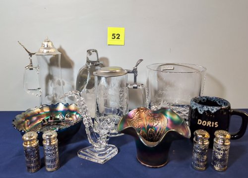 52. (2) Carnival Glass Bowls, (2) Beer Steins, (4) Silver Plated Salt + Pepper Shakers, & Decor