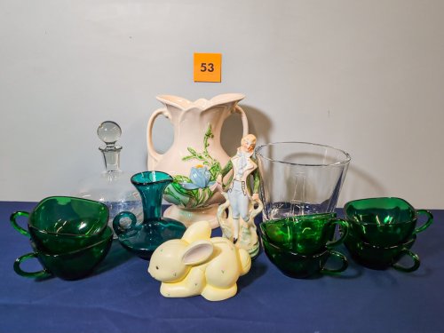 53. Hull Flower Vase, (6) Green Teacups, Collectible Figurine, & Decor