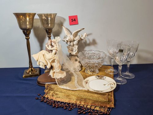 54. (3) Wine Glasses, Crystal Bowl, Collectible Wedding Figurine, & Decor