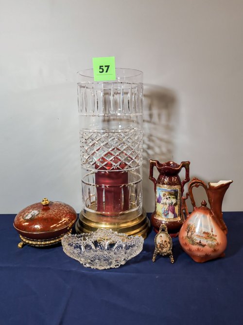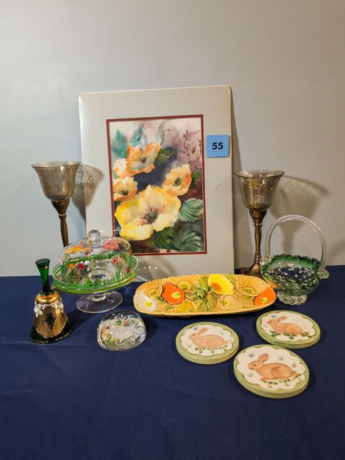 57. Large Candle Holder, Glass Candy Dish, & Painted Dishes