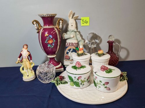 56. Ceramic Jam Jars + Serving Tray, Crystal Apple Jar, Collectible Figurine, & Decor