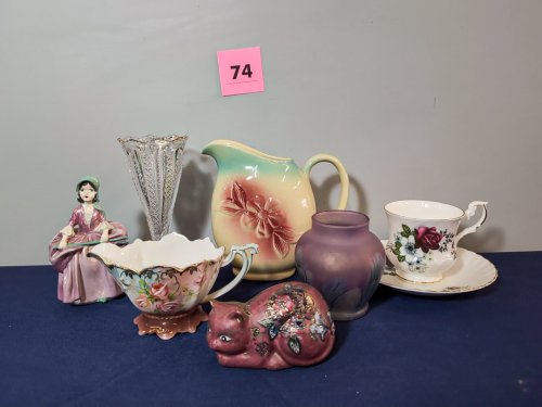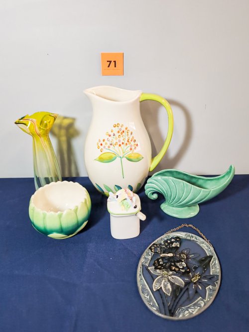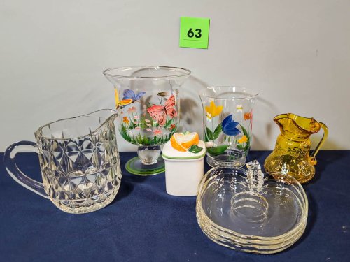 71. Painted Pitcher & Sugar Dish, Hand Blown Glass Vase, & Decor