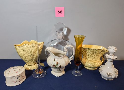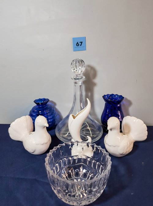 68. Glass Decanter, Hand Painted China, Hand Blown Glass Bell, & Bud Vase
