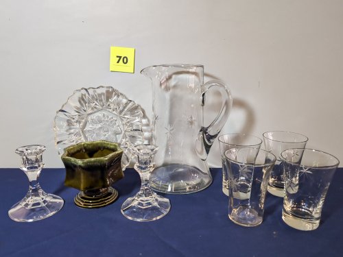 70. Pitcher, (4) Glasses, (2) Candlesticks, & (2) Candy Dishes