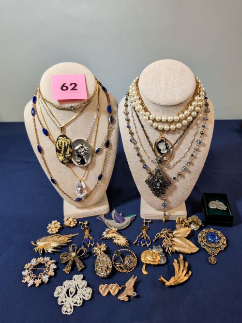 62. Fashion Jewelry (9) Necklaces, (4) Pairs of Earrings, (1) Pendant, & (12) Brooches