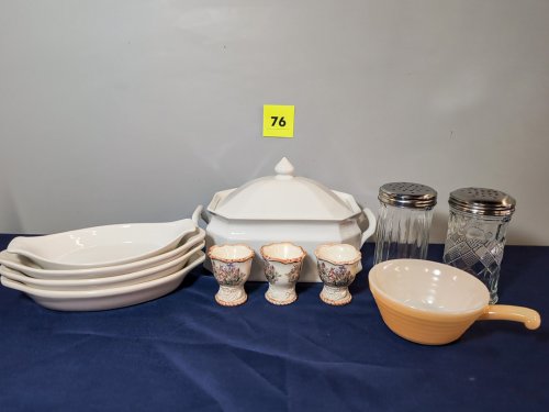 76. Casserole Dish, (4) Au Gratin Dishes, (3) Painted Egg Cups, Salt + Pepper Shakers, & Handled Soup Bowl