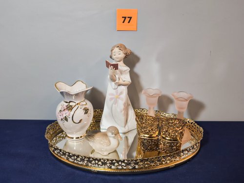 77. Mirrored Tray, Brass Music Box, Collectible Figurines, & Decor