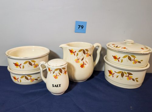79. Hall Autumn Leaf Pitcher, (4) Stacking Bowls with Lid, & Salt Shaker