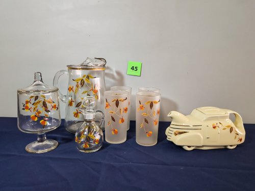 45. Hall Autumn Leaf 60th Anniversary Automobile Teapot, Autumn Leaf Pitcher, (4) Glasses, Small Decanter, & Candy Dish