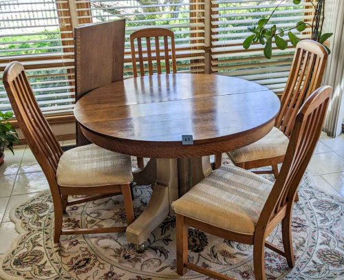 61. Antique Round Table w/ (4) 11.5″ Leaves + (4) Chairs