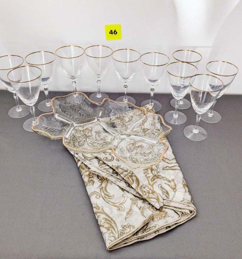 46. (11) Wine Glasses, Divided Tray + Tablecloth