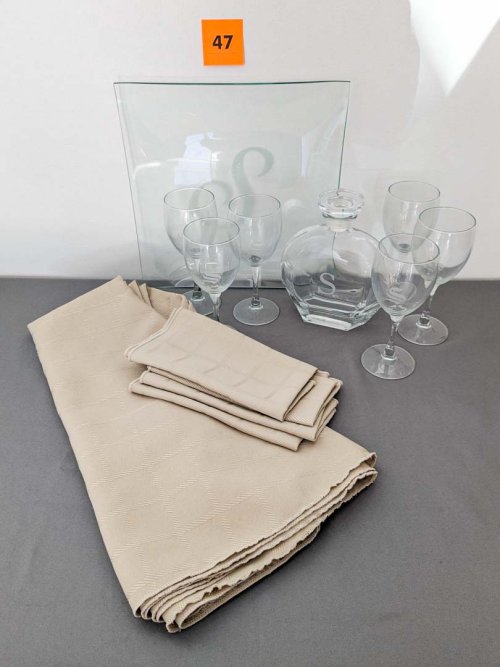 47. Platter, Decanter, (6) Wine Glasses, Tablecloth + Napkins