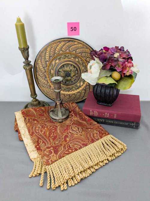 50. Table Runner, (2) Metal Candleholders, Decorative Plate, Book + Faux Floral