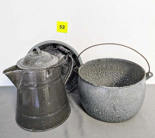 52. Graniteware Strainer, Coffeepot + Bucket