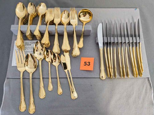 53. Home Concepts Stainless Gold -Tone Flatware – (16) Lg. Spoons, (32) Spoons, (16) Salad Forks, (14) Dinner Forks, (16) Knives + (8) Serving Utensils
