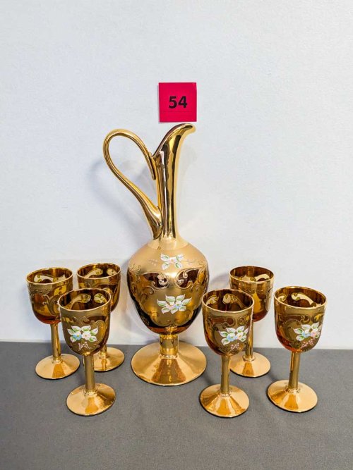 54. Amber + Gold Pitcher and (6) Glasses