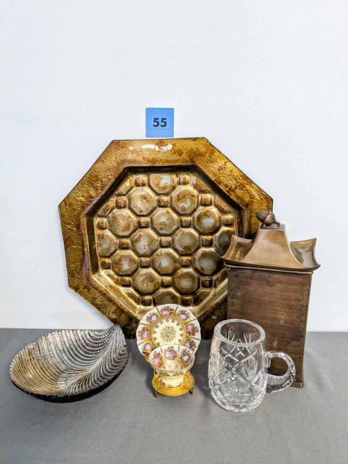 55. Metal Box, Teacup/Saucer, Crystal Mug, Glass Tray + Bowl