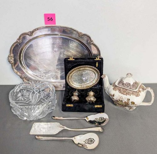 56. Mason’s Brown Transferware Teapot, Crystal Bowl, Silverplate Tray + Utensils
