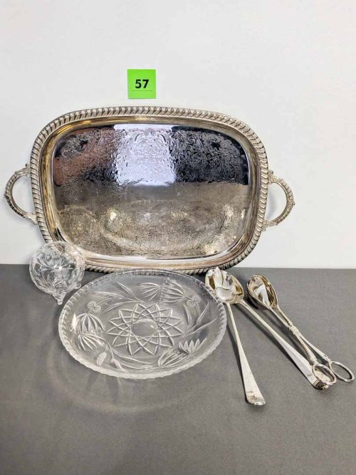 57. Silverplate Serving Utensils + Tray, Crystal Platter + Bowl