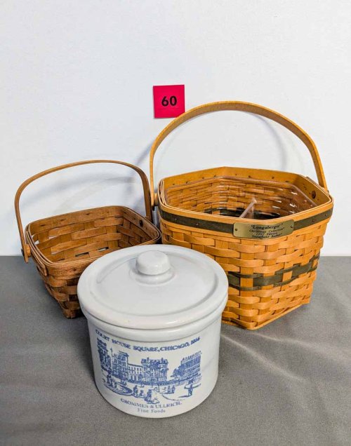 60. (2) Longaberger Baskets + Stoneware Crock w/ Lid