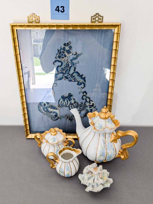 43. Dresden Figurine, Teapot, Creamer + Sugar and Framed Lace