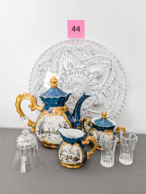 44. Crystal Platter, Teapot, Creamer + Sugar, Bell + (2) Shot Glasses