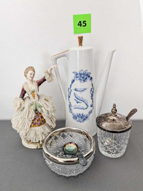 45. Dresden Figurine, Coffeepot, Jam Jar + Bowl w/ Spoon