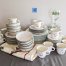 55. Pfaltzgraff Winterberry Dishes – (12) Dinner Plates, (12) Salad Plates, (12) Bowls, (12) Teacups/Saucers, (4) Wine Glasses, Tablecloth + Napkins