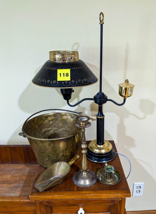 118. Lamp + Brass Bucket + (3) Brass Pieces