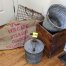 “172. Antique Wire Basket + Galvanized Water Can and Bucket + Wood Box + Gunny Sacks” has been added to your cart.