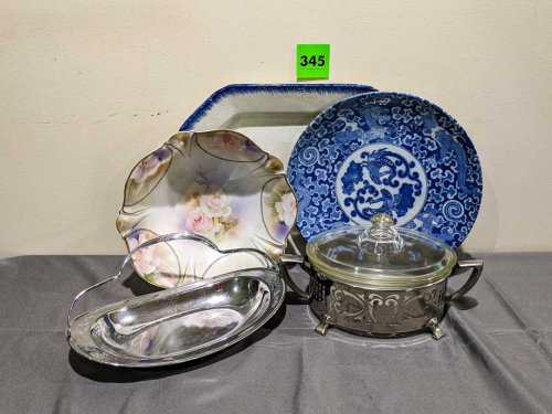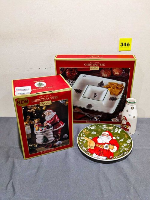 346. Spode Tray + Santa Plate + (4) Milk Glass Pieces + Candy Dish